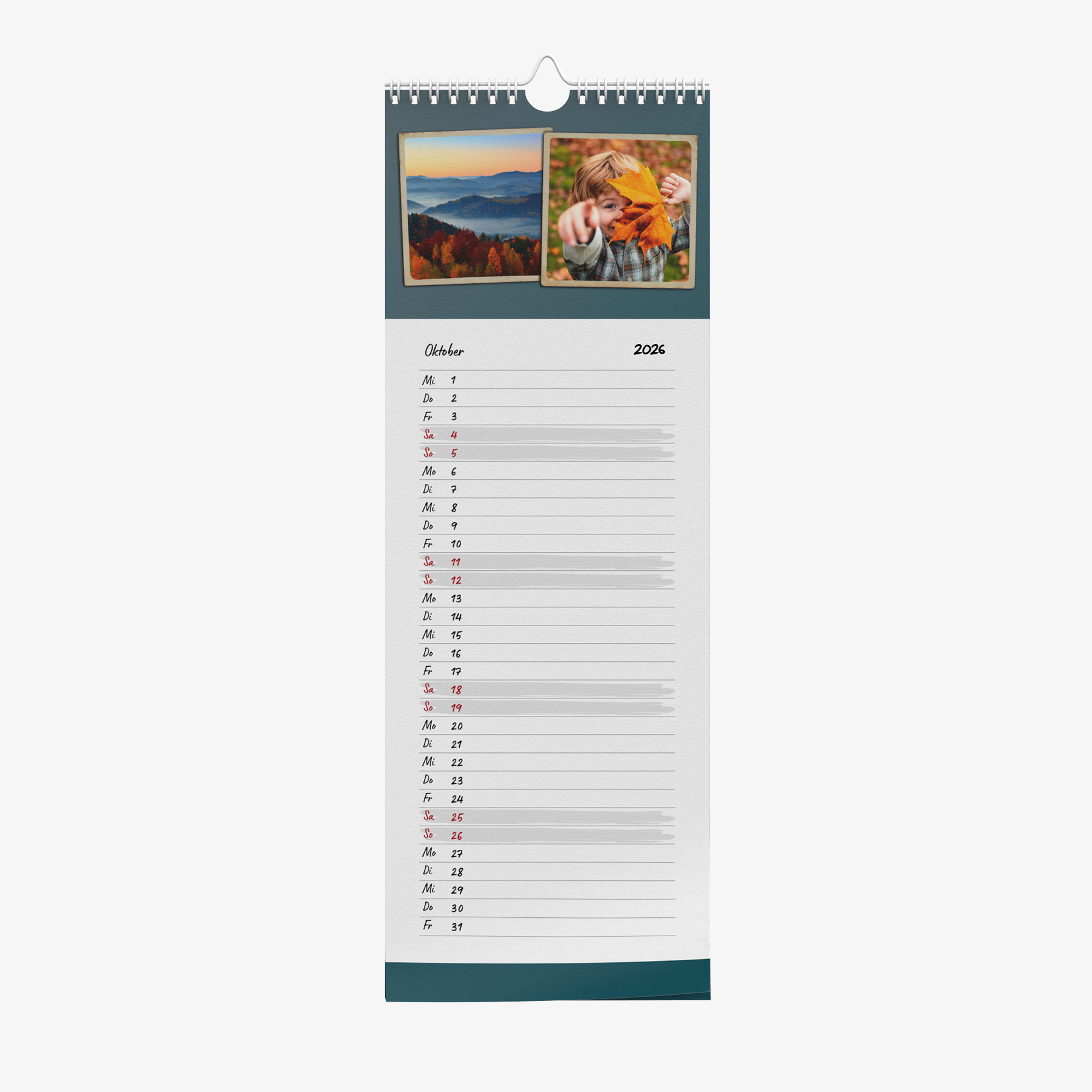 Im schlanken Format 15 x 42 cm passt der ifolor Küchenkalender in jede Wohnung – am besten natürlich in die Küche – und bietet dir dabei trotzdem jede Menge Platz für Termine, Geburtstage, Verabredungen und Co. Beim Gestalten deines persönlichen Küchenkalenders kannst du aus verschiedenen Designvorlagen wählen. Je nach gewähltem Layout passen auf die Kalenderseiten bis zu zwei und auf das Deckblatt bis zu drei Fotos.