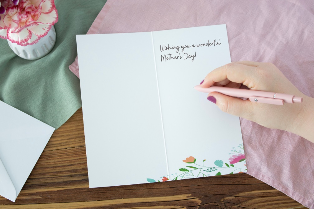 Verleihe deinen Muttertagsgrüssen deine persönliche Note, indem du deine Glückwünsche oder einen Spruch per Hand in die Karte schreibst. Möchtest du den Text lieber hineindrucken lassen, kannst du diesen nachträglich per Hand signieren, um die Karte mit deinem Charme abzurunden.