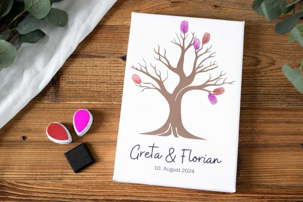 Mit einer schön gestalteten Leinwand und ein bisschen Farbe kann das frisch vermählte Paar gemeinsam mit seinen Gästen eine wunderschöne Erinnerung zaubern. Am besten platzierst du die Leinwand und verschiedene Farben am Eingang der Hochzeitslocation. Ein Motiv könnte z.B. ein Baum sein, der durch die bunten Fingerabdrücke der Gäste eine schöne Krone bekommt. Nutze zur Gestaltung unsere Fotoleinwand, um sie noch persönlicher zu machen. Mit Hilfe eines Grafikprogrammes kannst du die Namen des Brautpaares, das Hochzeitsdatum und ein Baum als Bilddatei erstellen. Diese Datei kannst du anschliessend über unseren Online-Editor hochladen und auf eine Leinwand drucken. Das gemeinschaftliche Kunstwerk kann so noch persönlicher gestaltet und durch die Fingerabdrücke der Gäste vollendet werden.