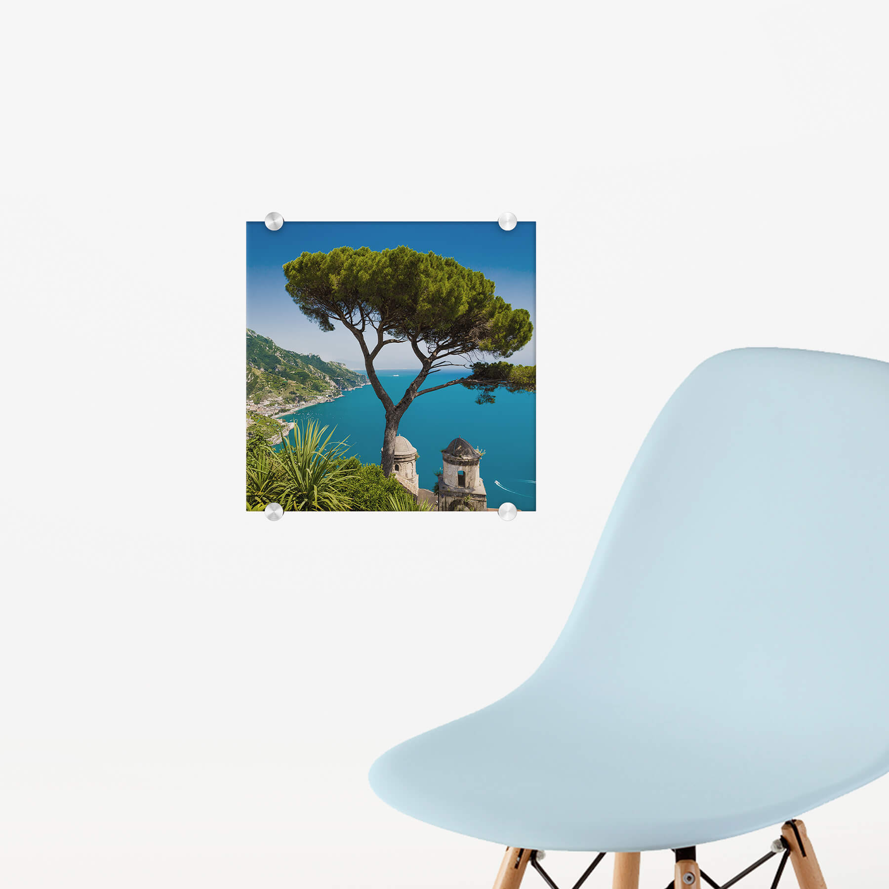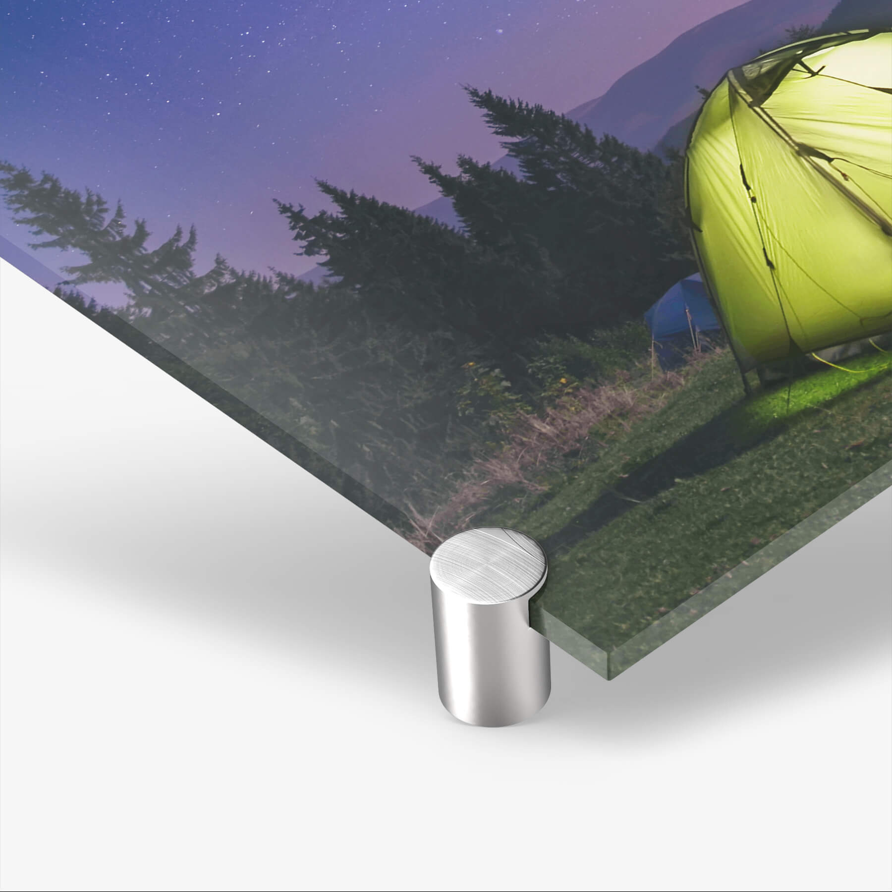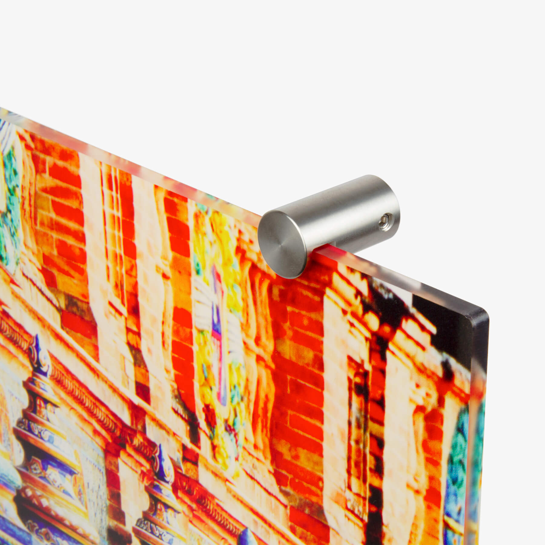 YDie Acrylglasplatte bringst du mit Hilfe der mitgelieferten Spezialaufhängung an der Wand an. Die vier silbernen Halterungen sorgen nicht nur für den tollen Schwebeeffekt, sondern sind auch von vorn sichtbar und verleihen eine elegante Note.